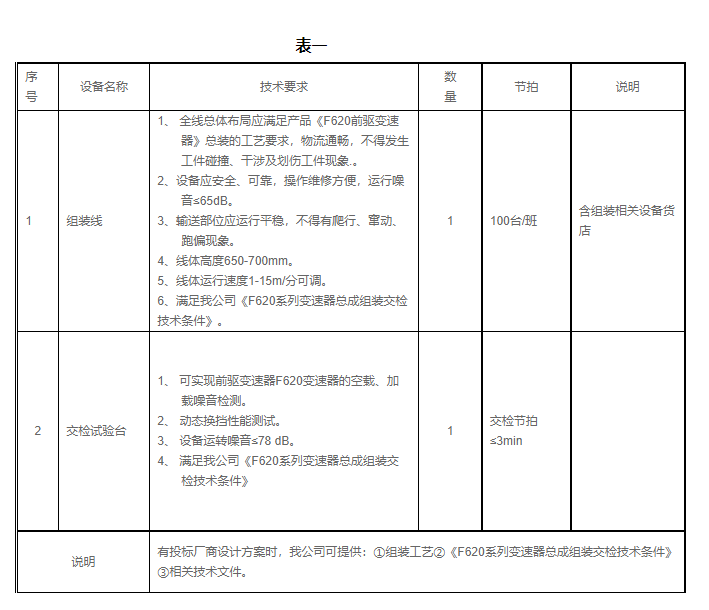 本次采购设备的内容及技术要求见表一,其中组装线与相关设备一并打包采购。