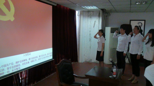 会上,今年发展的4名新党员进行了入党宣誓仪式,他们在领誓人的带领下面向党旗,庄严宣誓。