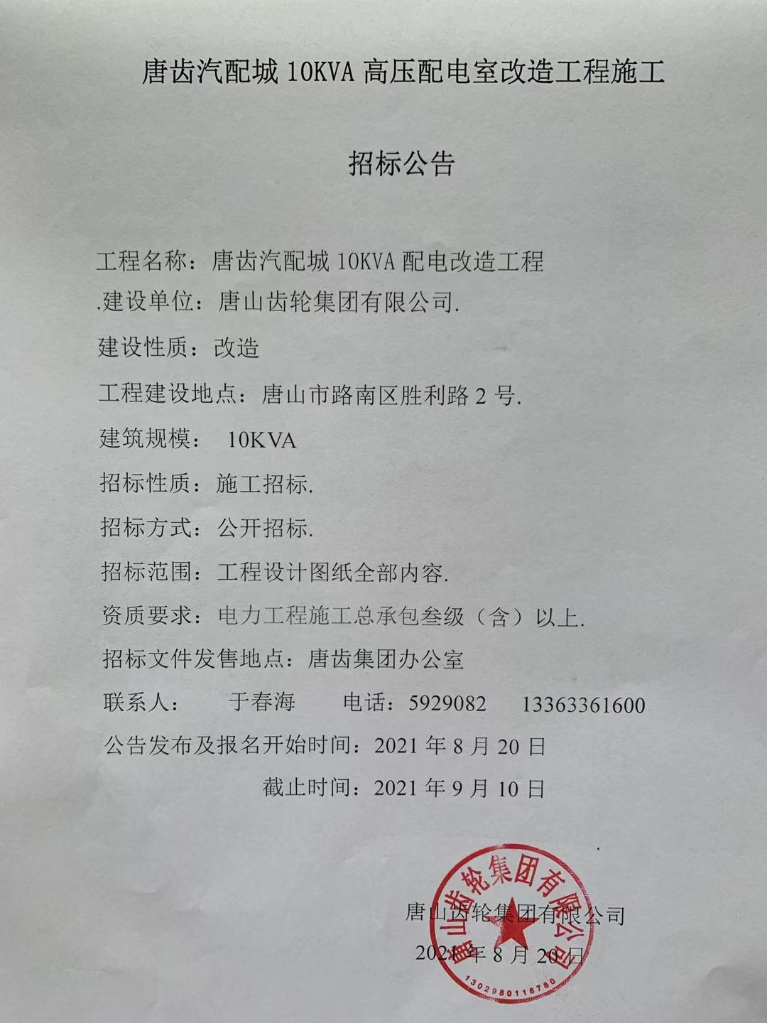 唐齿汽配城10KVA高压配电室改造工程施工招标公告