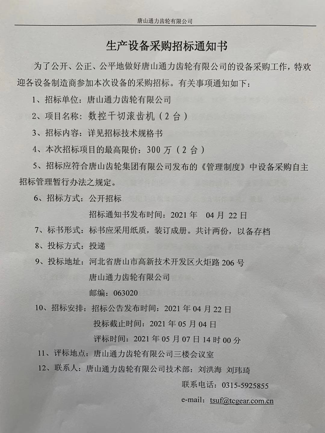 【概要描述】唐山通力齿轮有限公司数控干切滚齿机2台设备采购招标公告