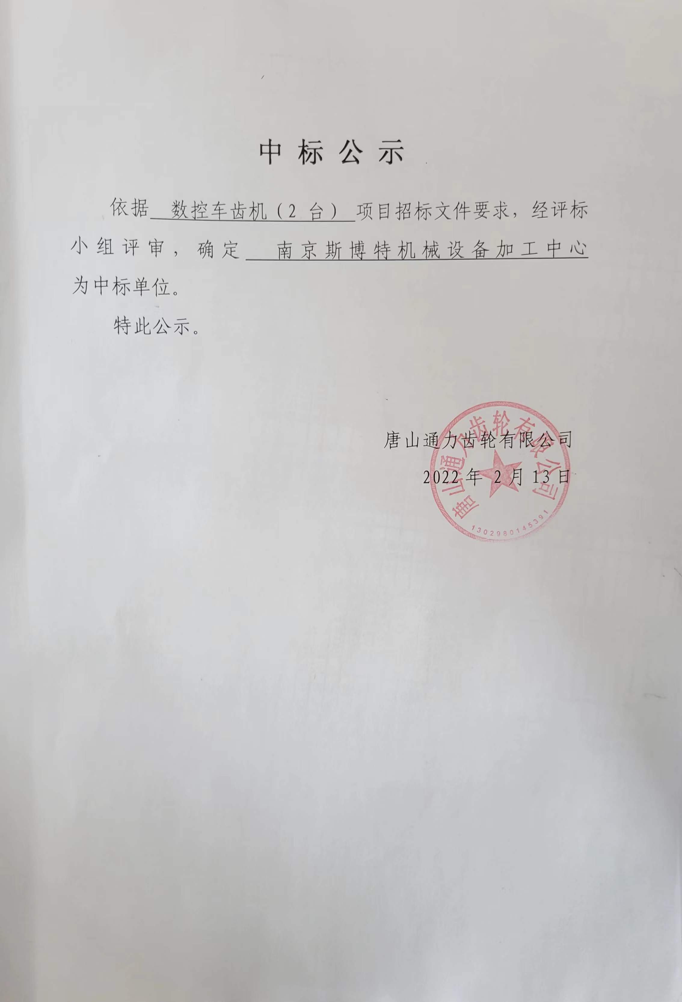 唐山通力齿轮集团有限公司关于数控车齿机两台项目中标公告