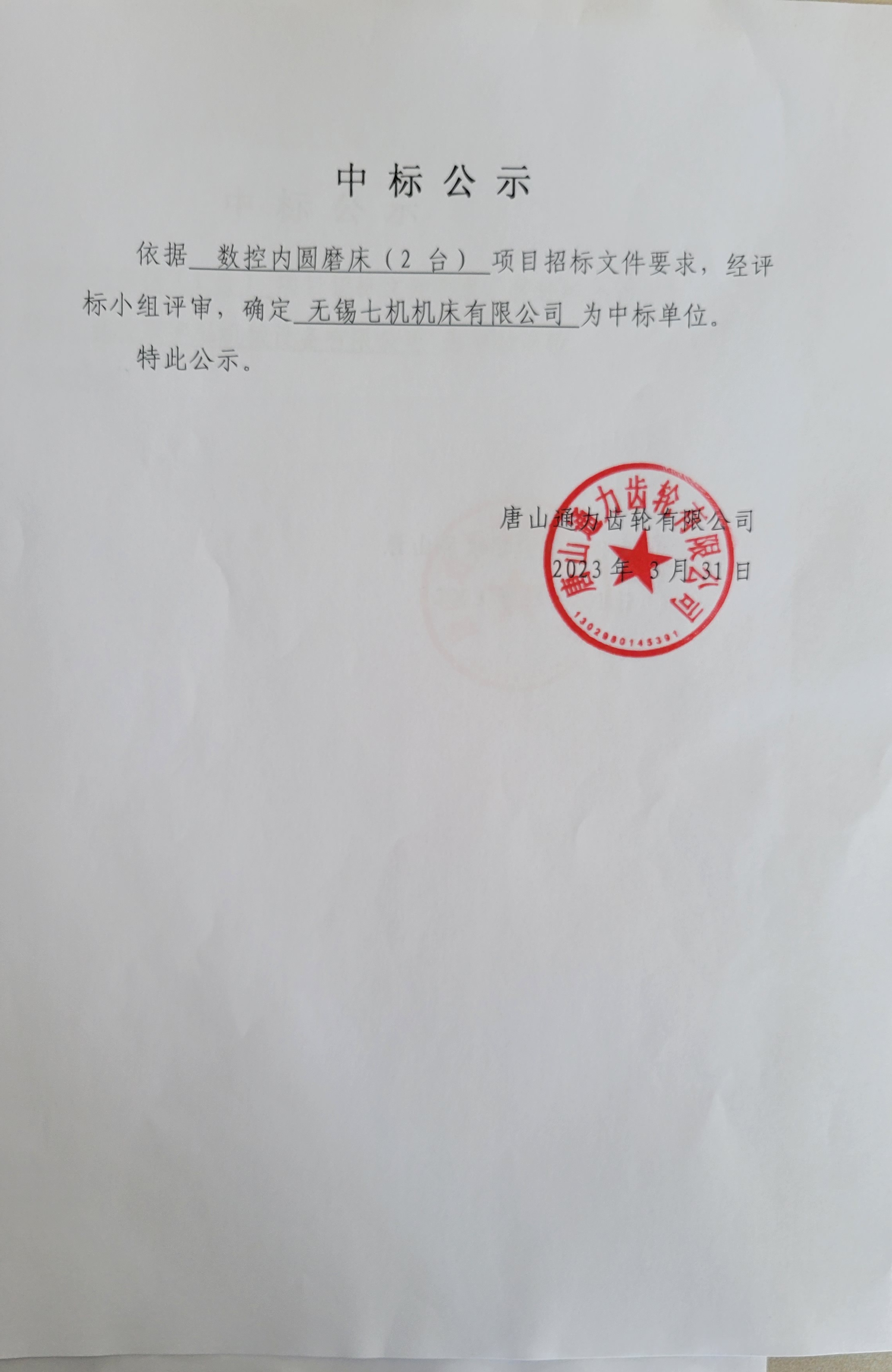 唐山通力齿轮集团有限公司关于数控内圆磨床(2台)项目中标公告