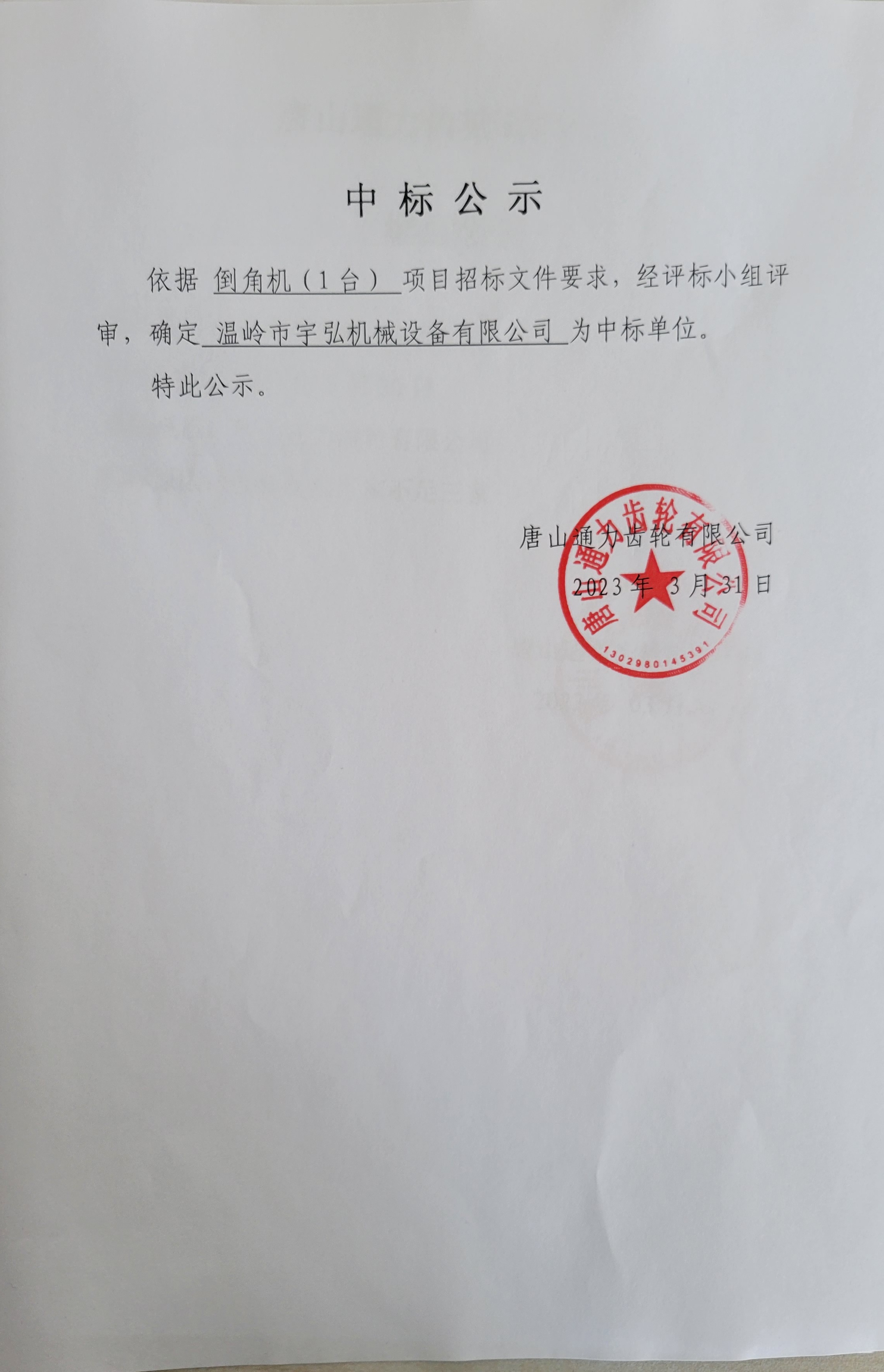 唐山通力齿轮集团有限公司关于倒角机(1台)项目中标公告