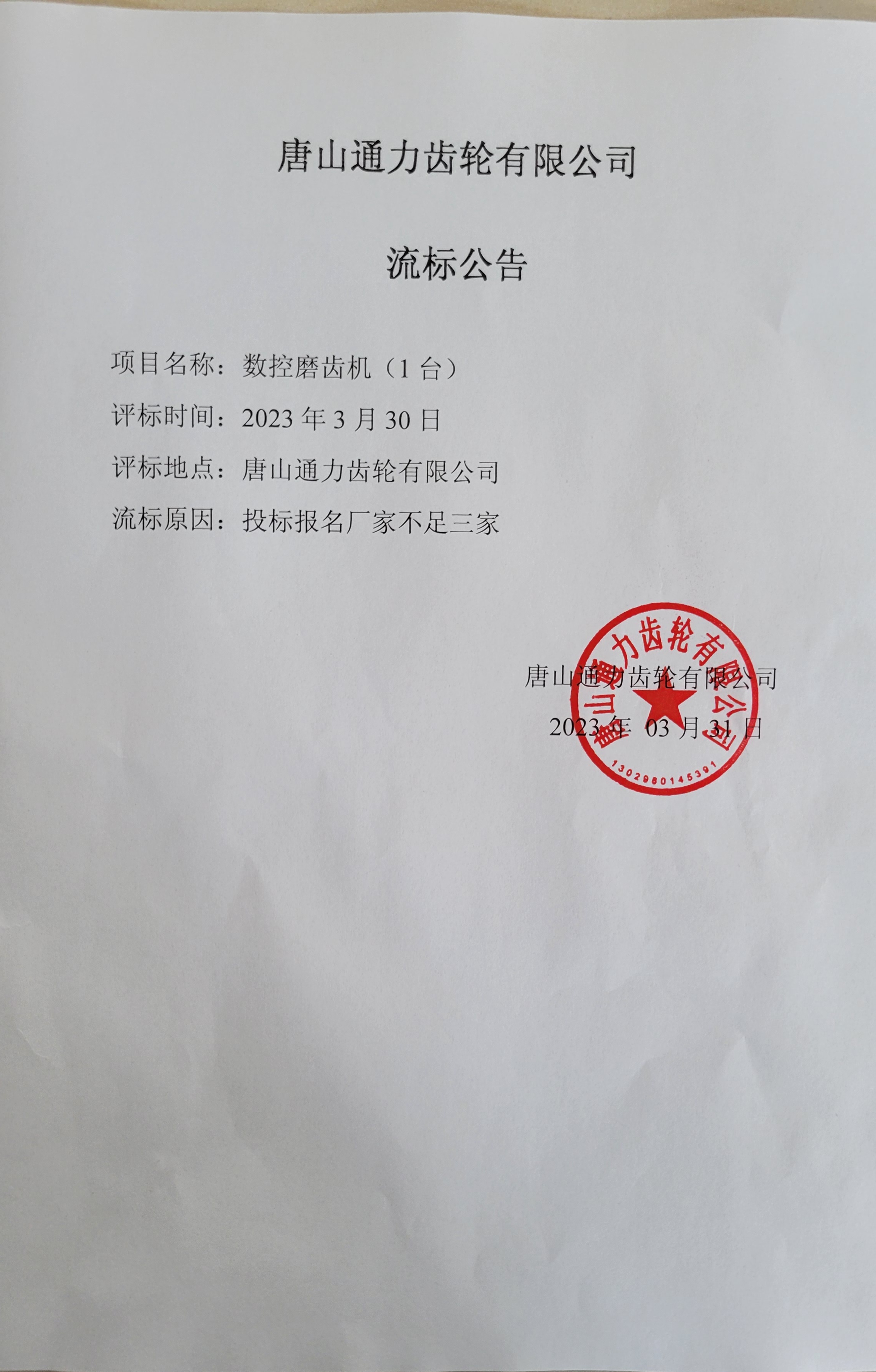 唐山通力齿轮集团有限公司关于数控磨齿机(1台)项目流标公告