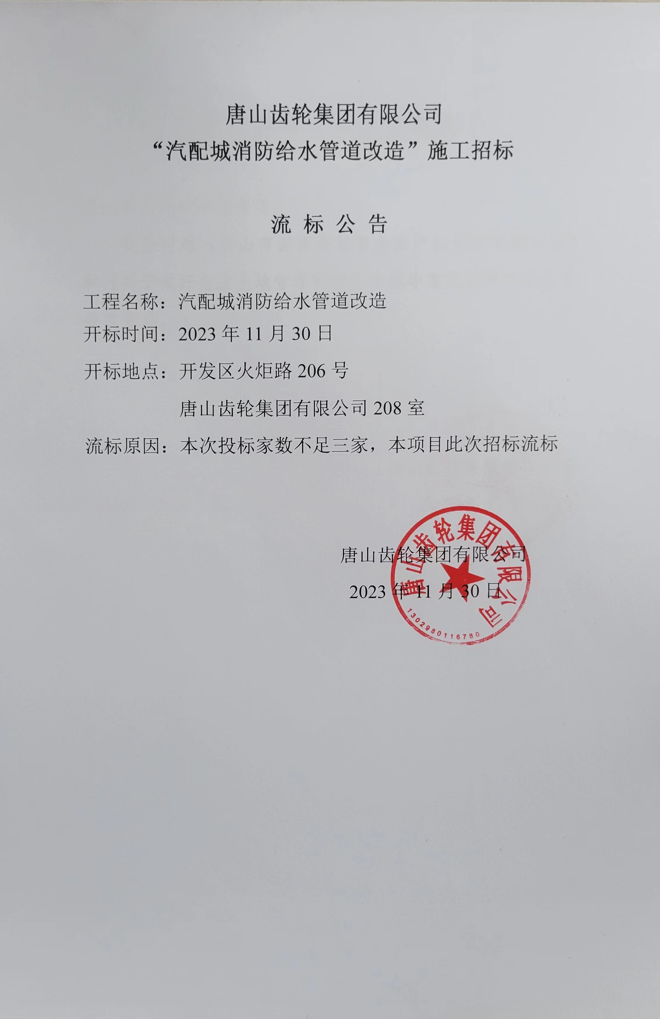 赢博线上平台“汽配城消防给水管道改造”施工招标流标公告