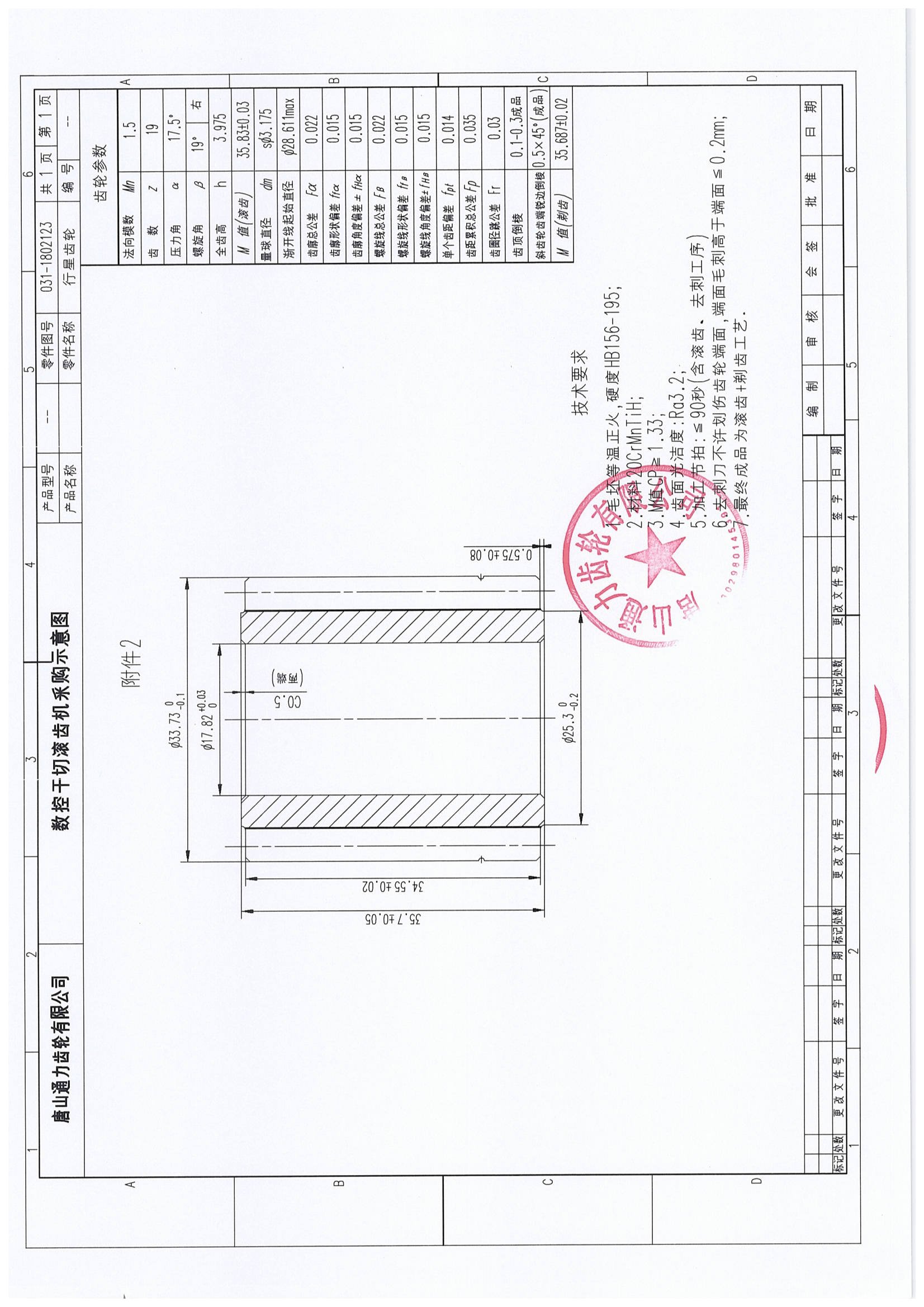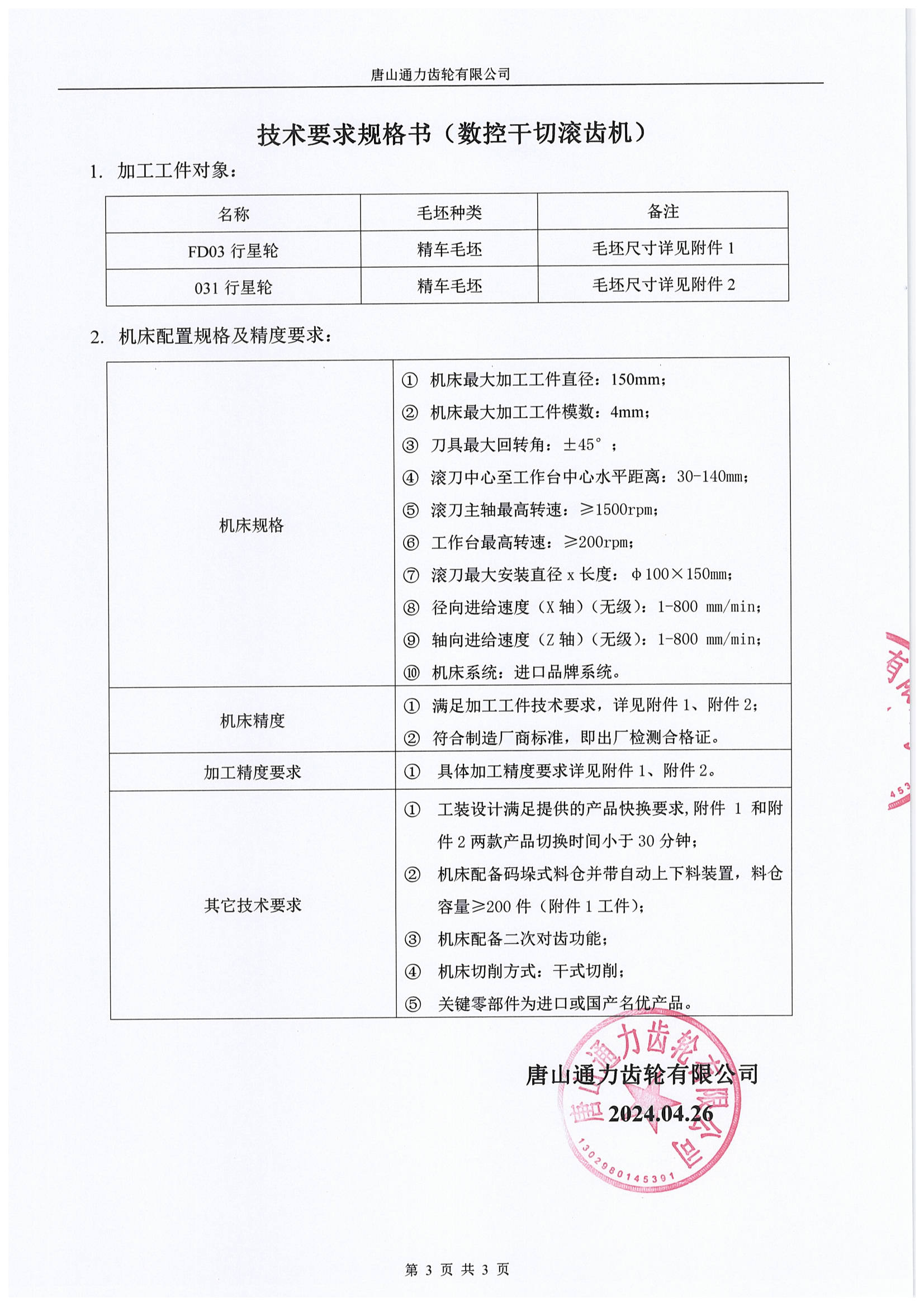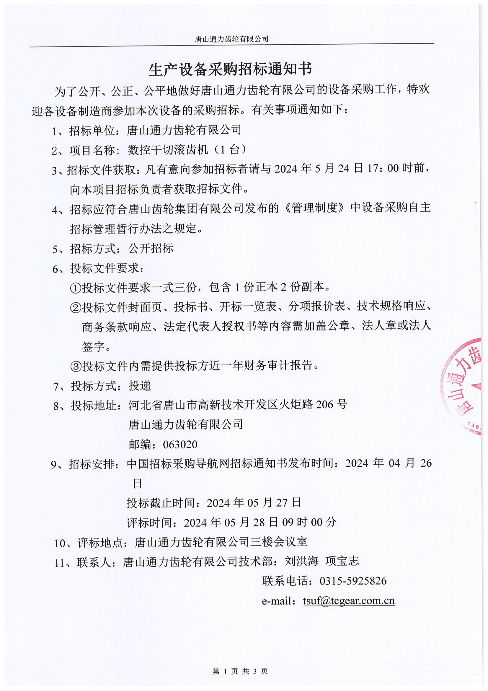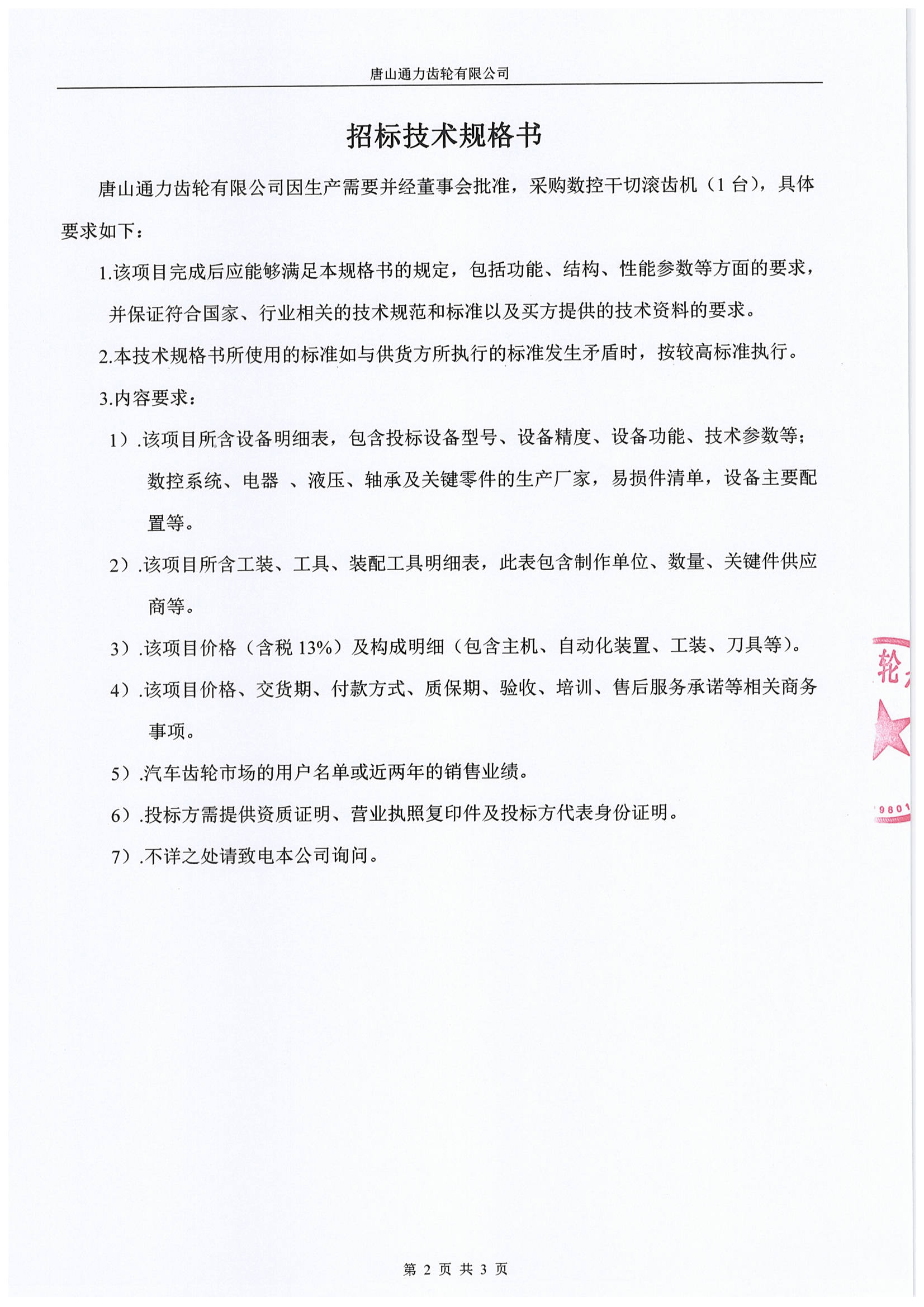 唐山通力齿轮公司数控干切滚齿机(1 台)采购招标通知
