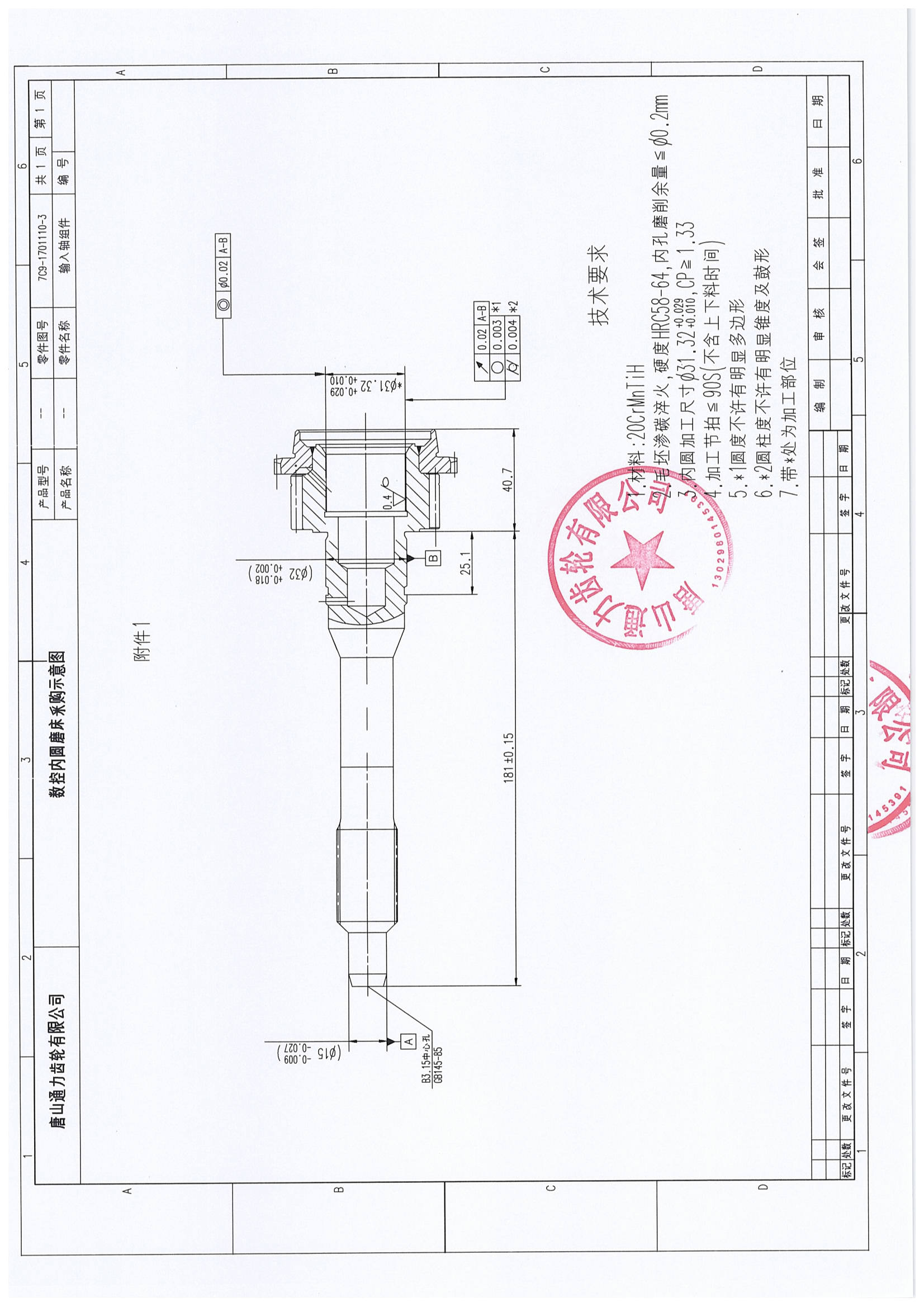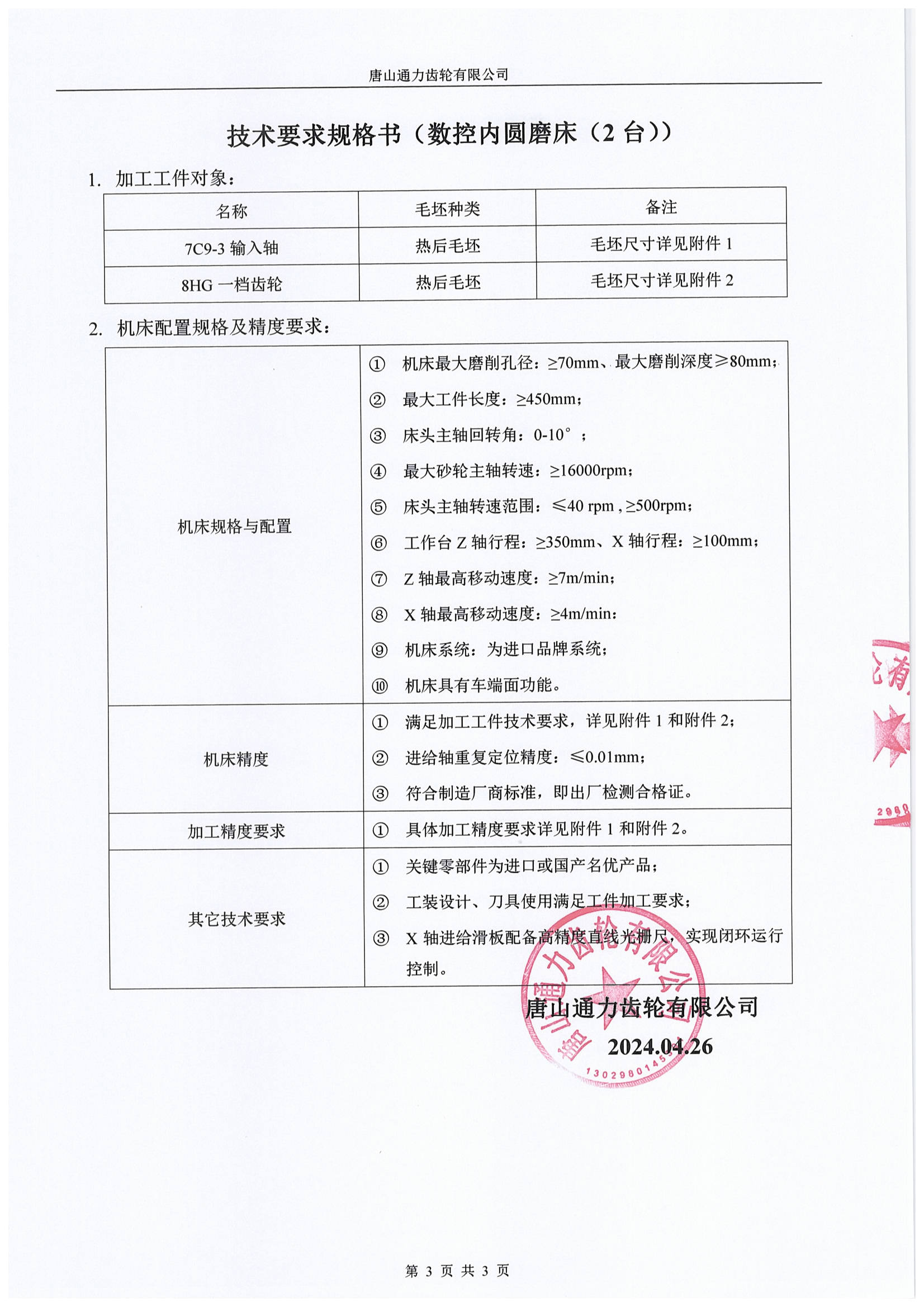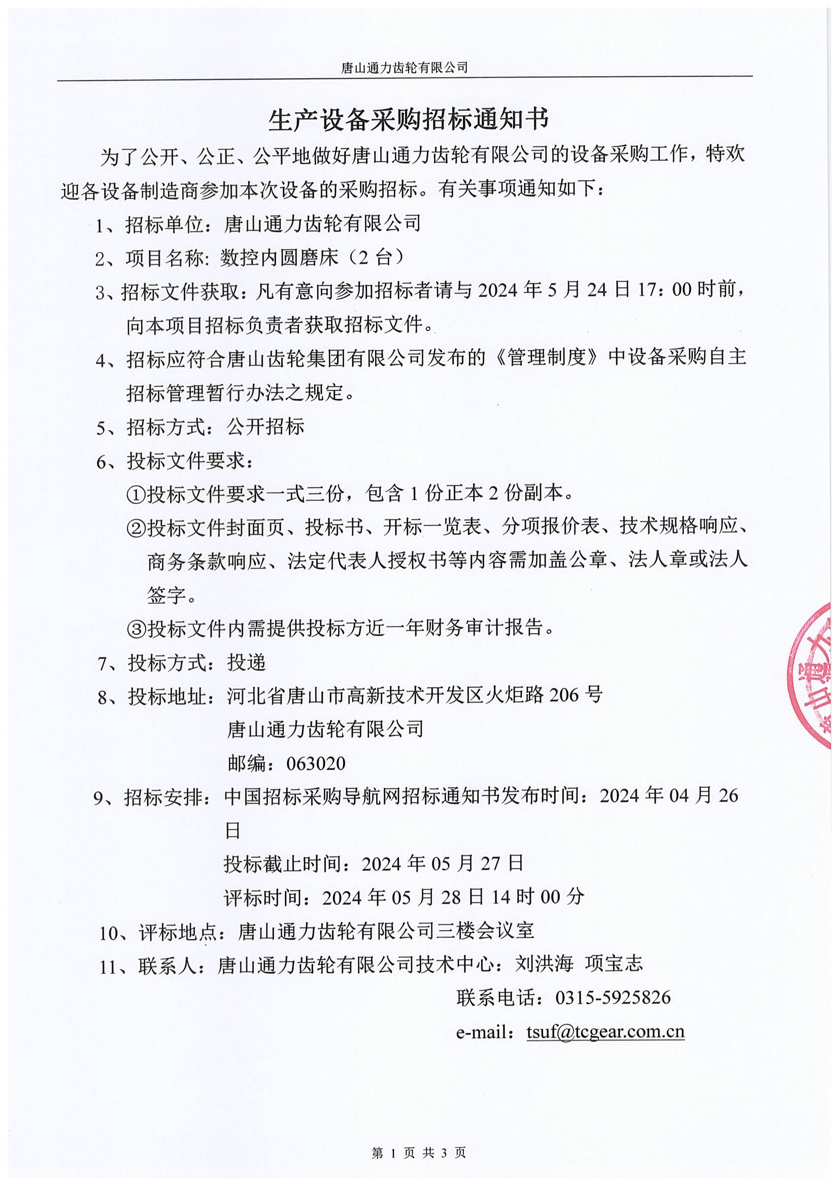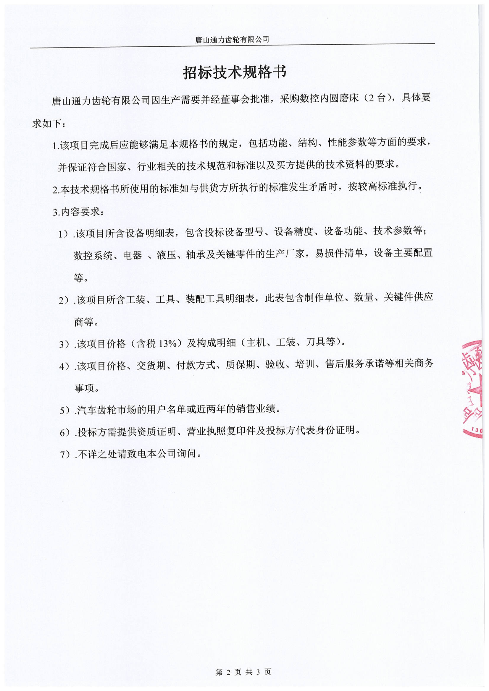 唐山通力齿轮公司数控内圆磨床(2 台)采购招标通知