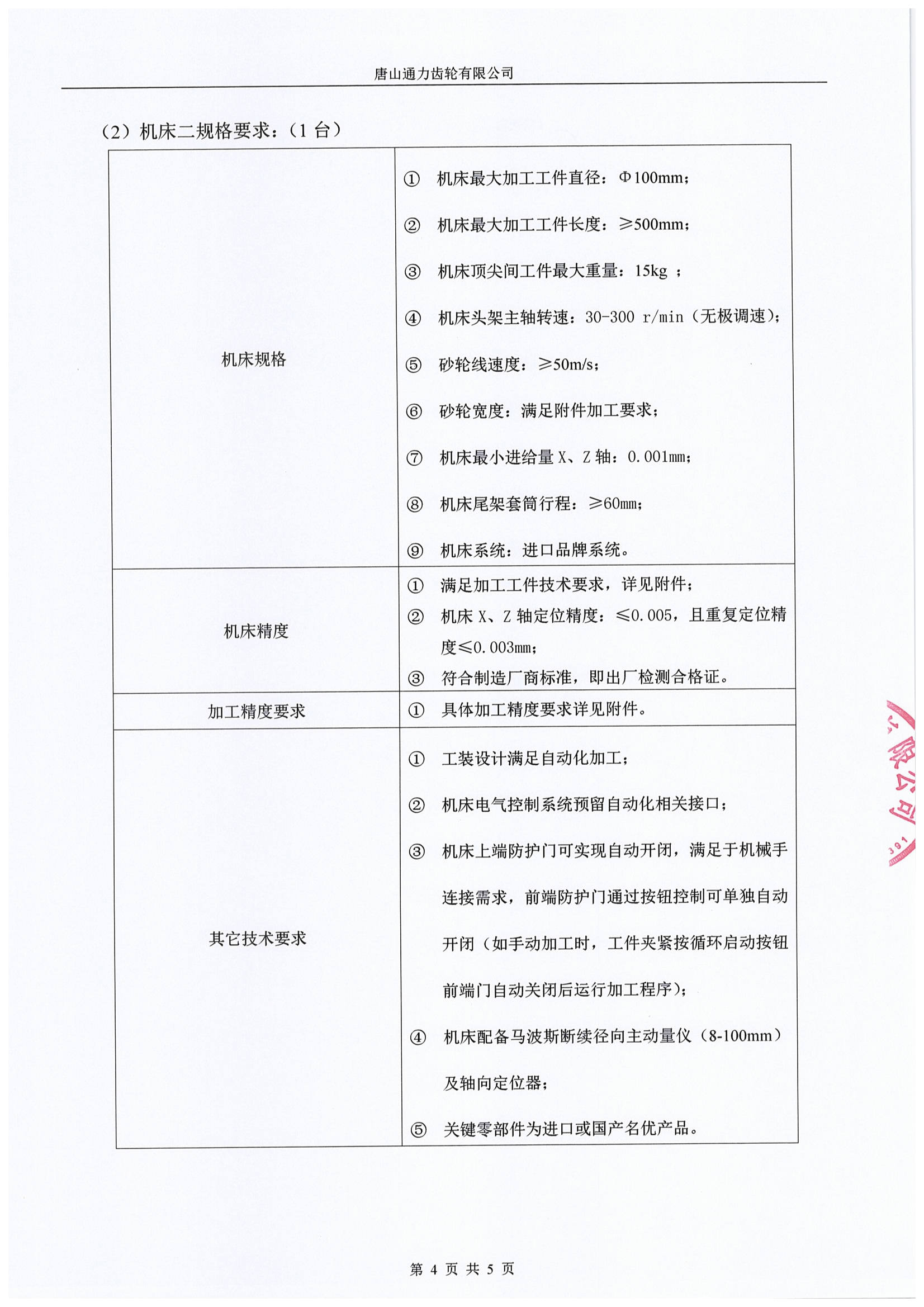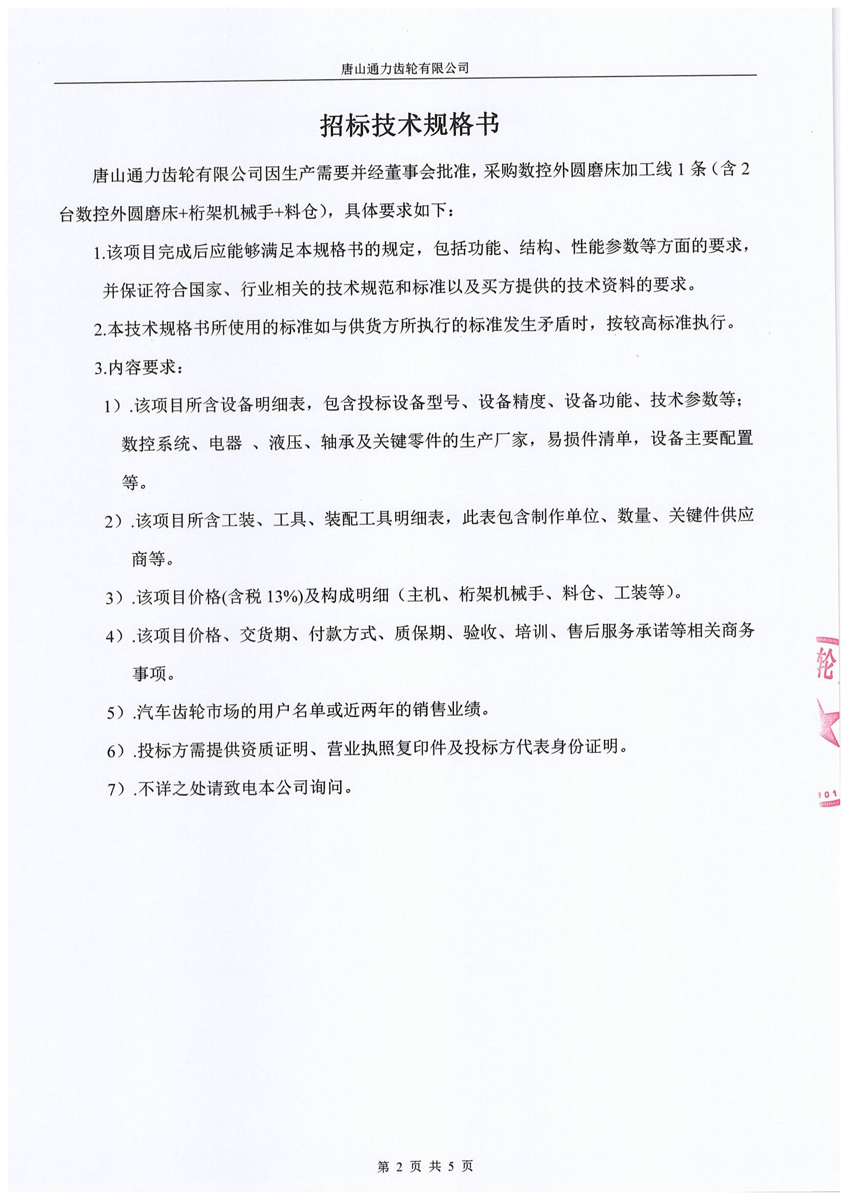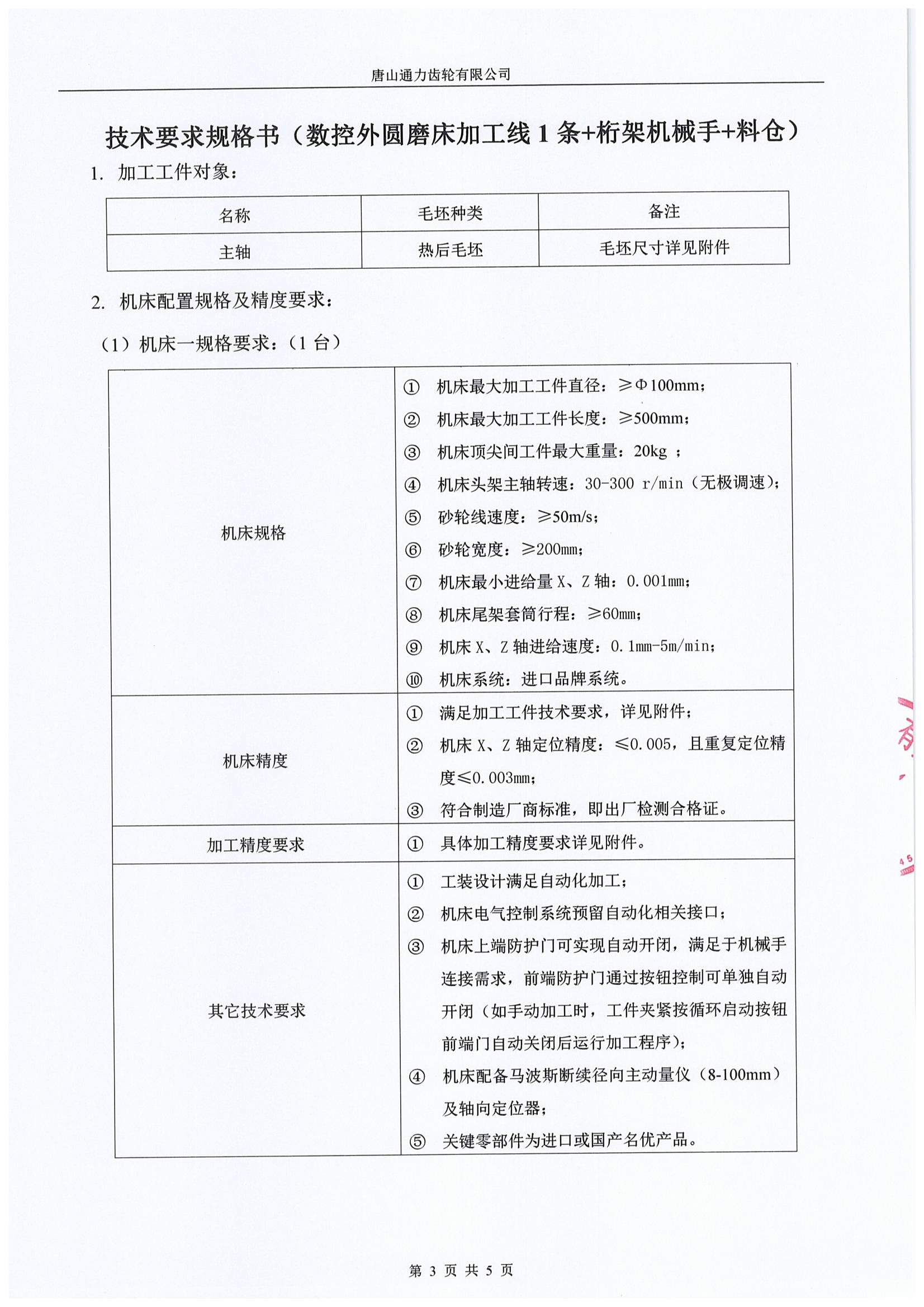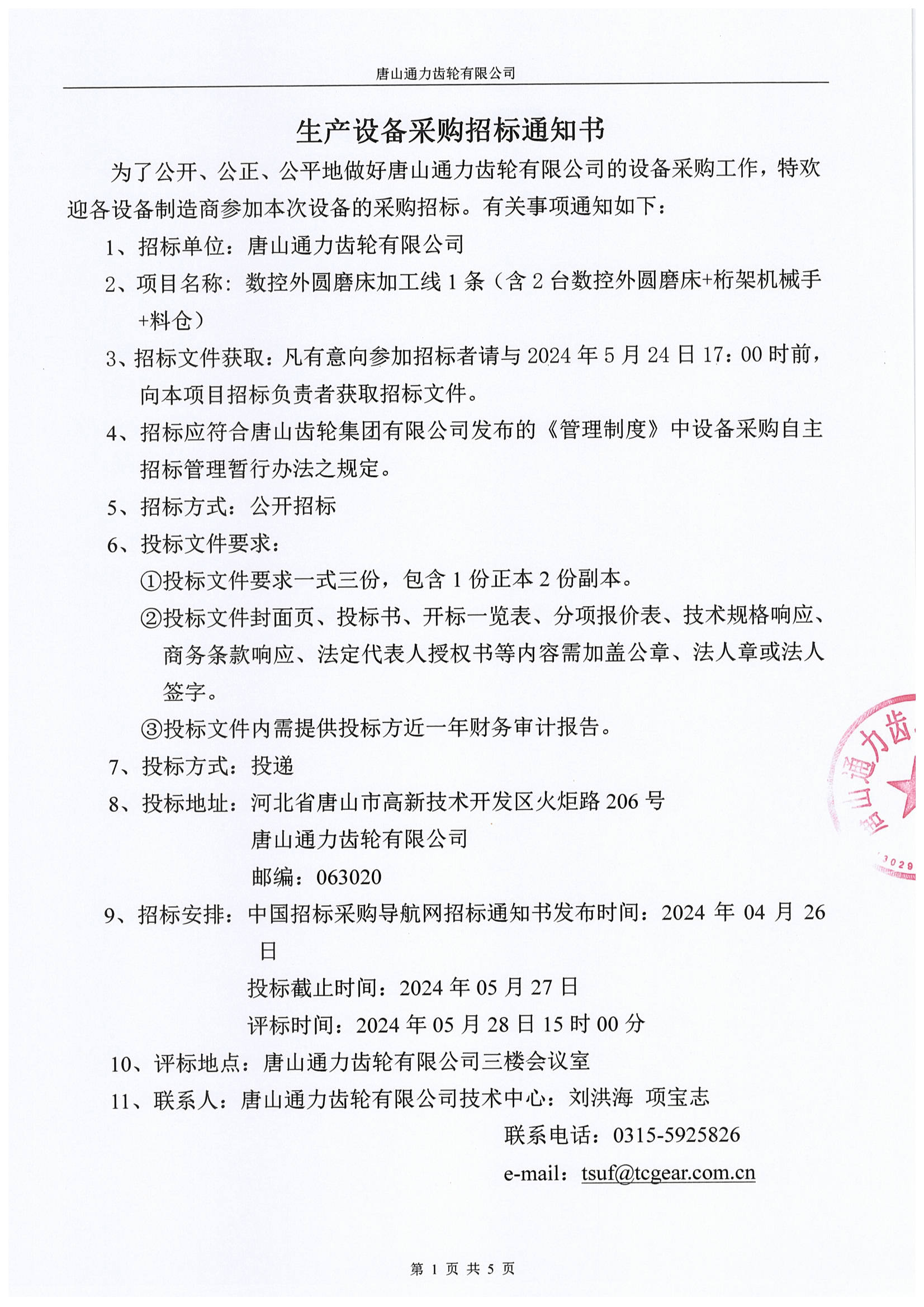 唐山通力齿轮公司数控外圆磨床加工线1条采购招标通知