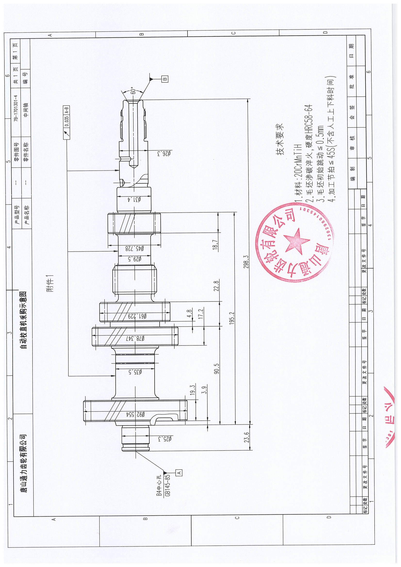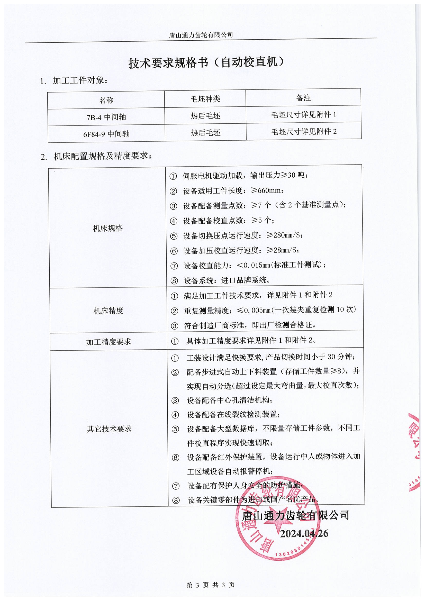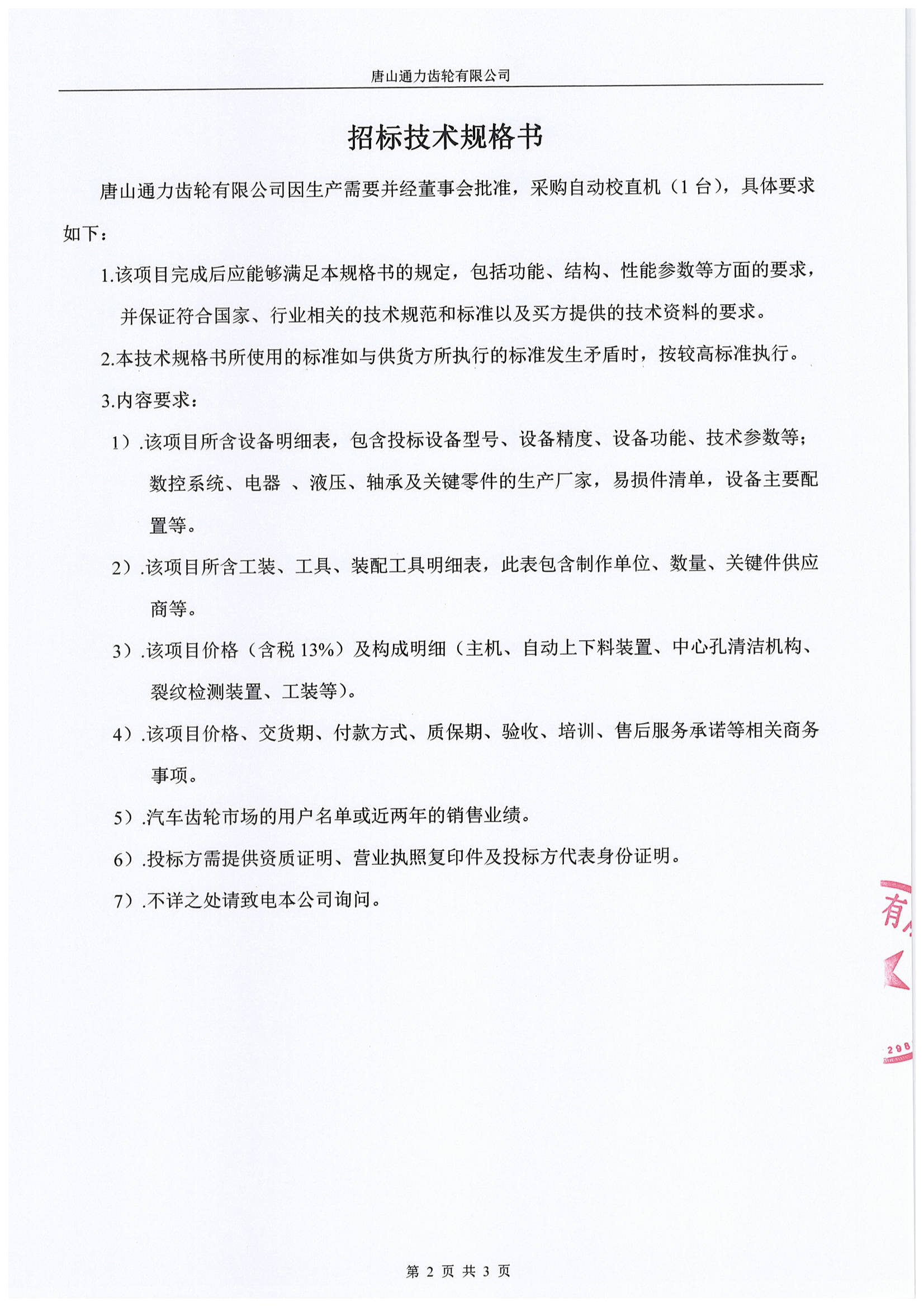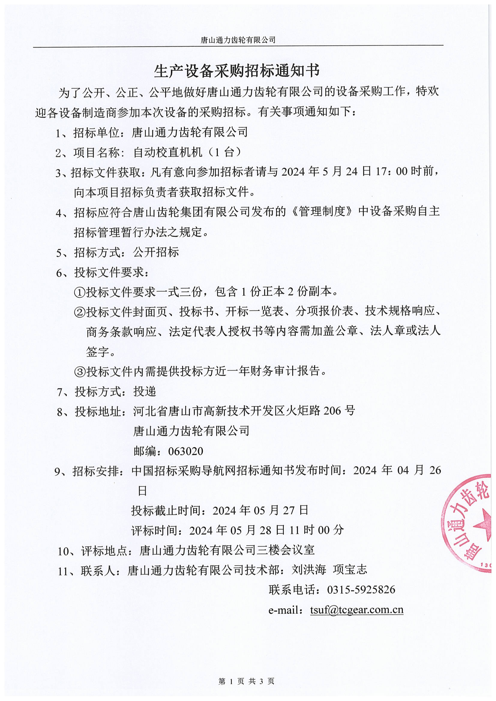 唐山通力齿轮公司自动校直机机( 1台)采购招标通知