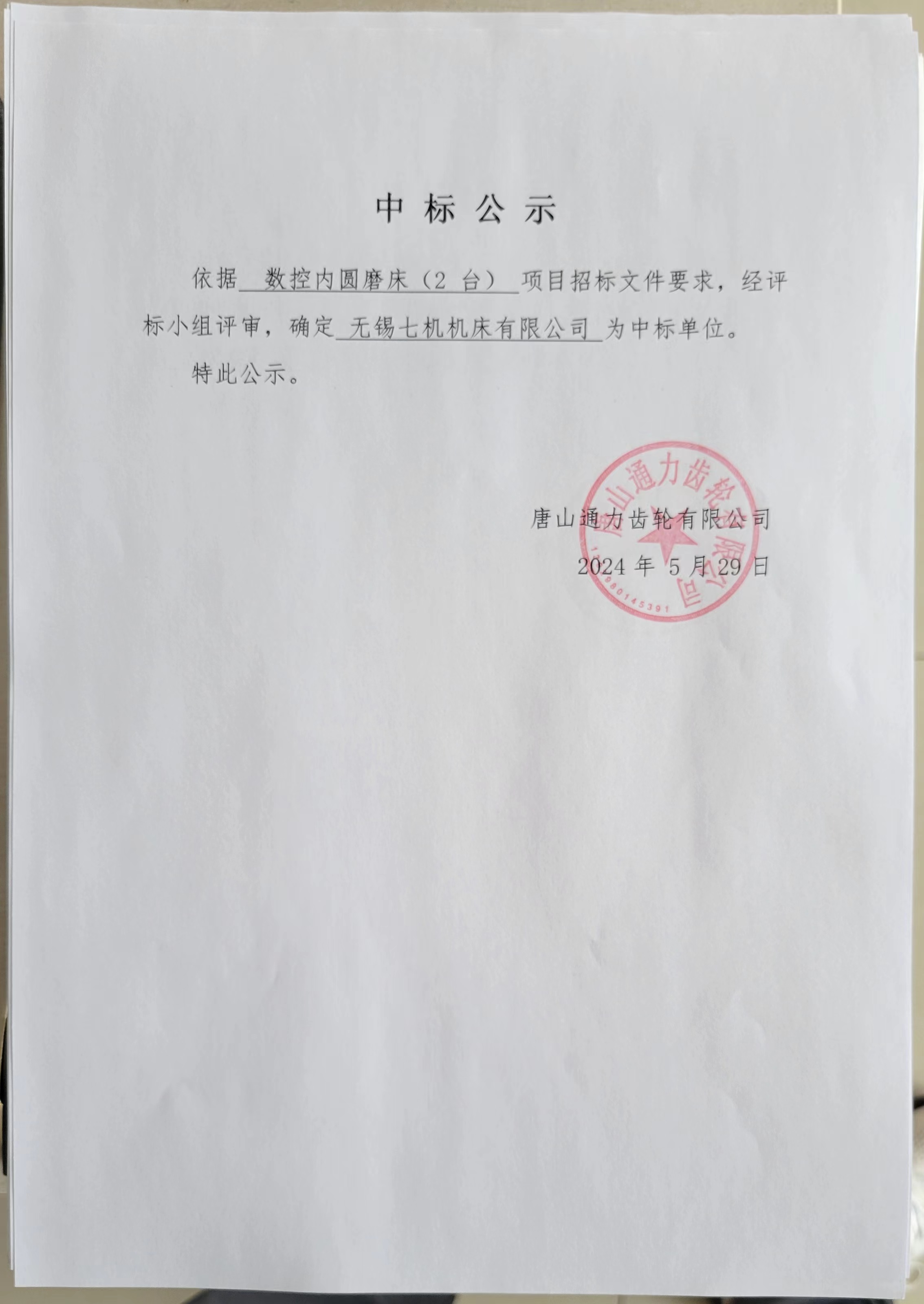 唐山通力齿轮有限公司数控内圆磨床(2台)中标公示