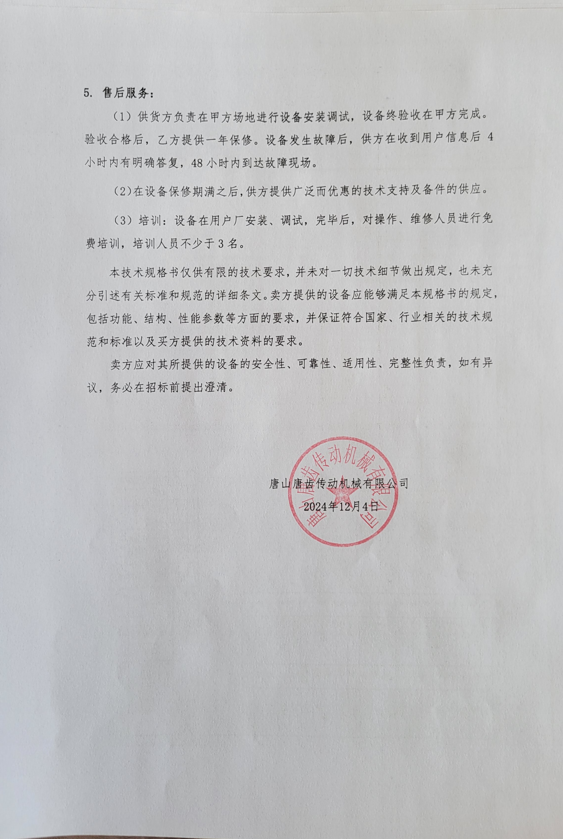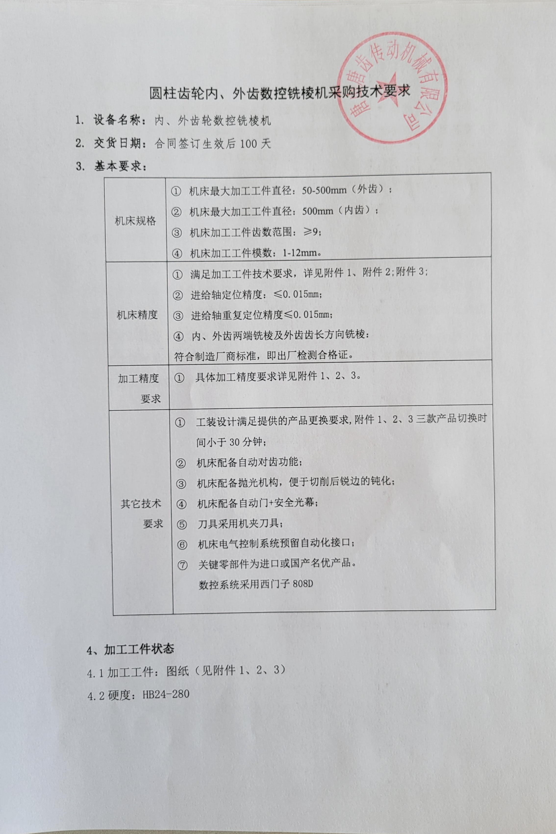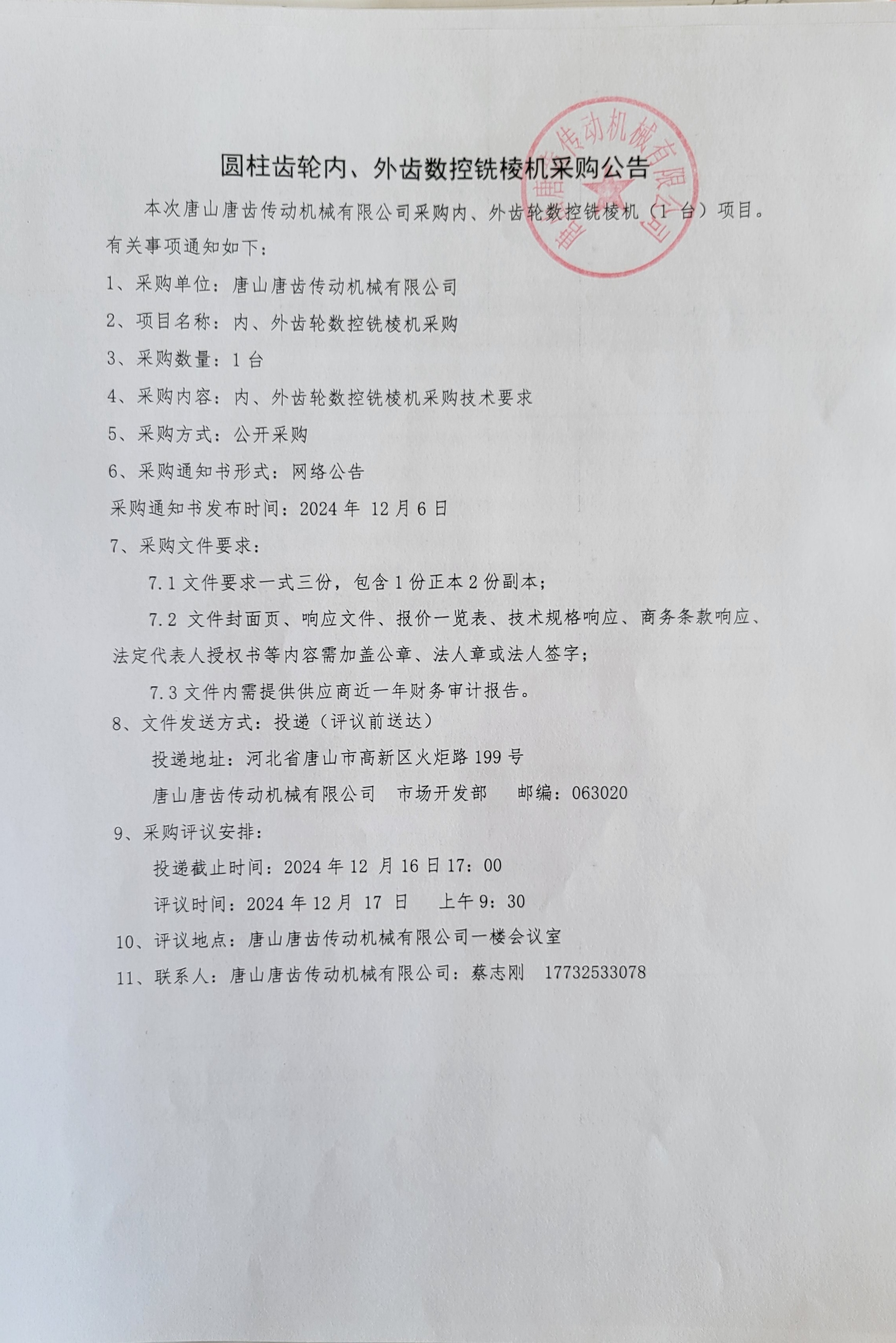 唐山唐齿传动机械有限公司圆柱齿轮内、外齿数控铣棱机采购公告