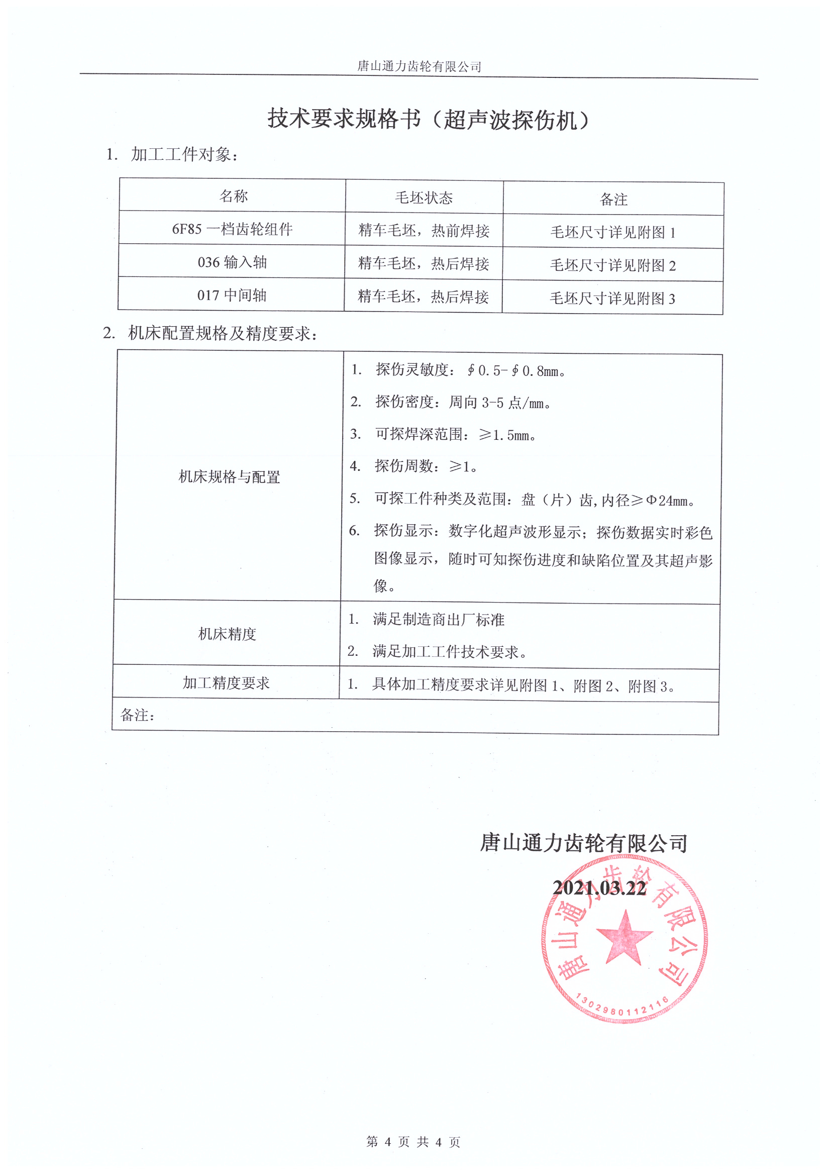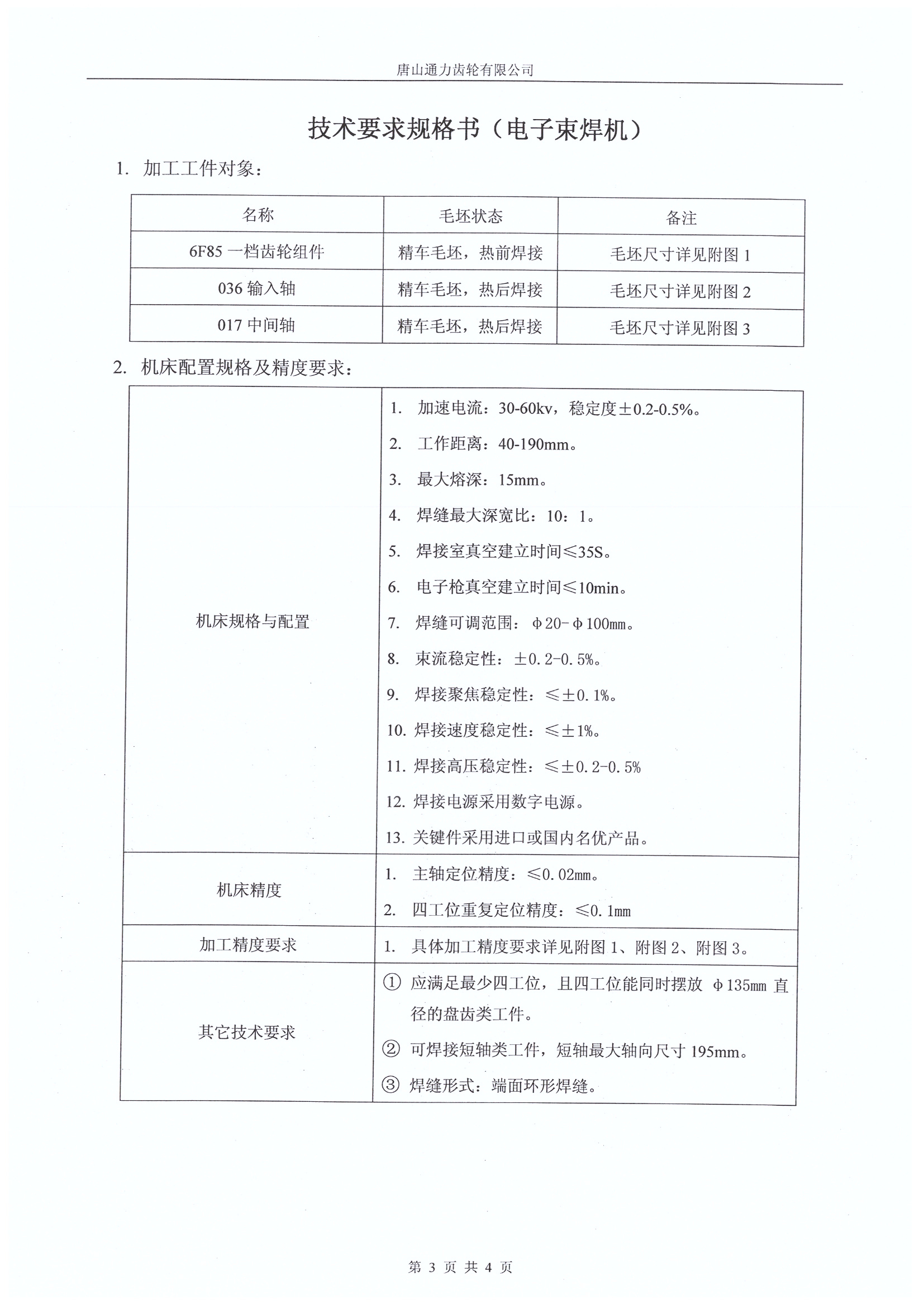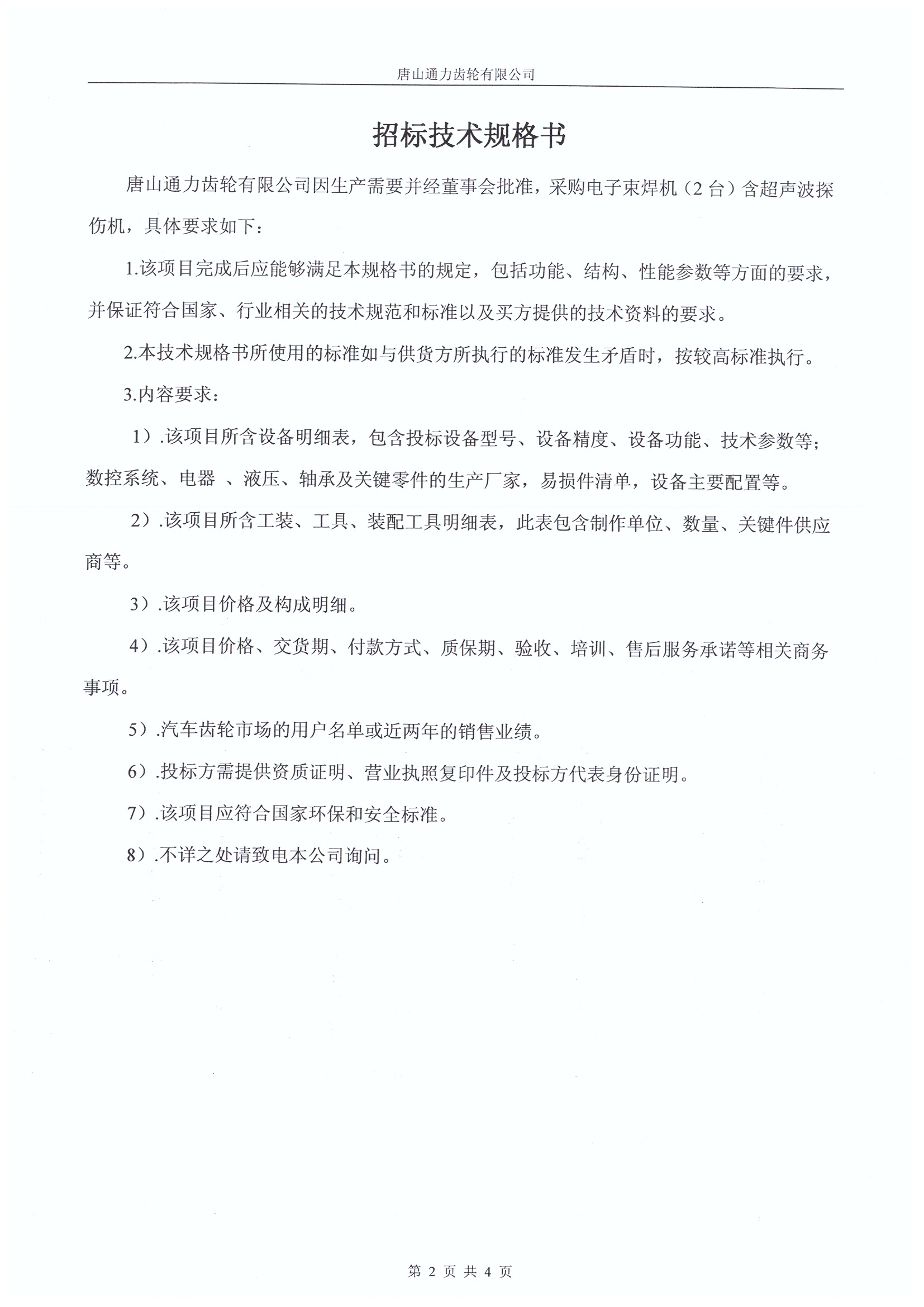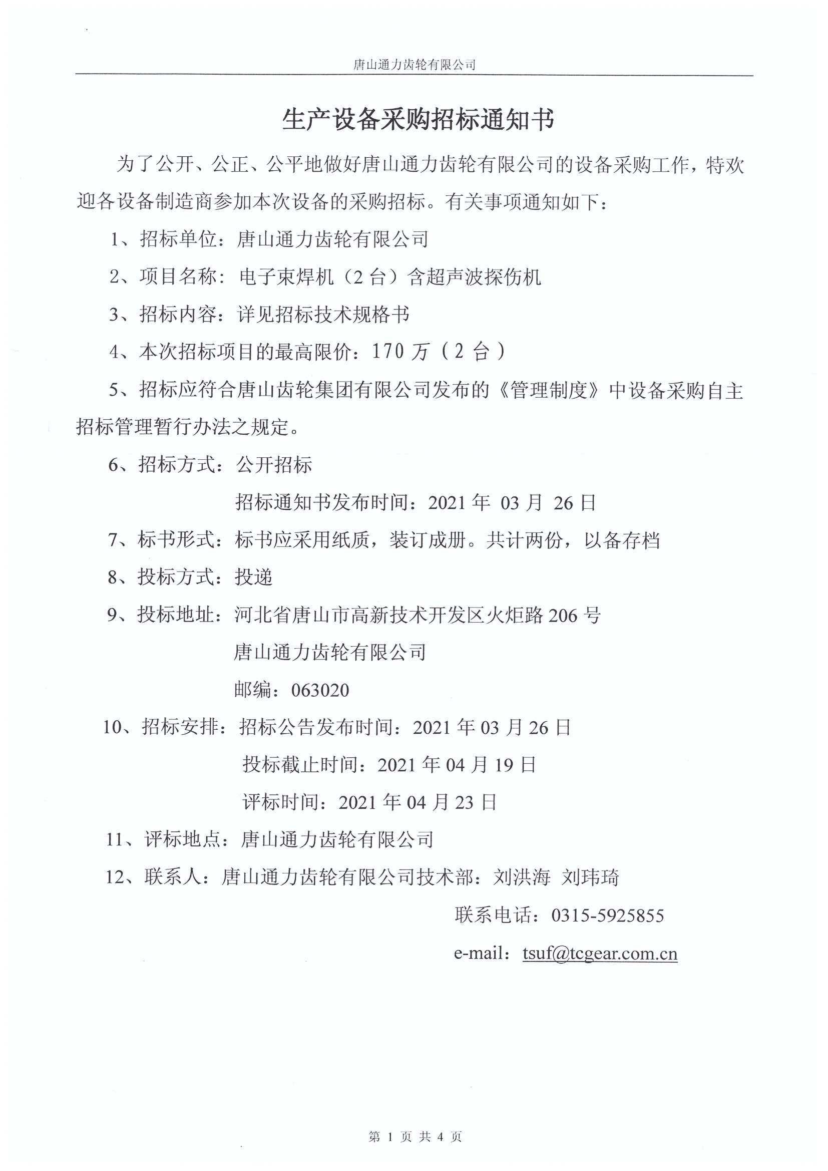 【概要描述】唐山通力齿轮有限公司电子束焊机(2台)含超声波探伤机设备采购招标公告
